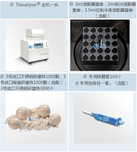 *  通常用于DNA和RNA分離的少量樣品可在一次性離心管中制備.可采用聚四氟乙烯材料制成的適配器,容納5或10個一次性樣品試管,進行細胞破碎.在多樣品組織研磨機中細胞組織在極短的時間內得到快速而有效的破碎,因而無需額外的低溫制冷